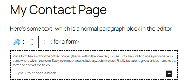 When you choose the PZ Form Wrap block, a box with a dotted border will appear on your page or post. All form elements will be added within this box (the dotted border is not visible in the front-end view).