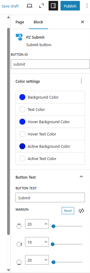 While the pznonce block requires no configuration, the PZ Submit button has a couple of configurable items, found in the right-hand block inspector panel: