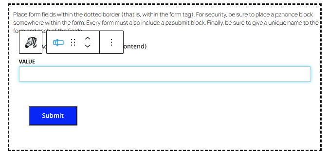 There are two blocks that have to go in each form: the pznonce block and the submit button (future releases will not need a submit button in some cases, but for now, all forms are conventionally submitted with a button click). The pznonce block is automatically inserted as soon as you edit within the form block, so you don’t need to worry about remembering to put it there.