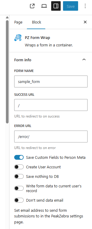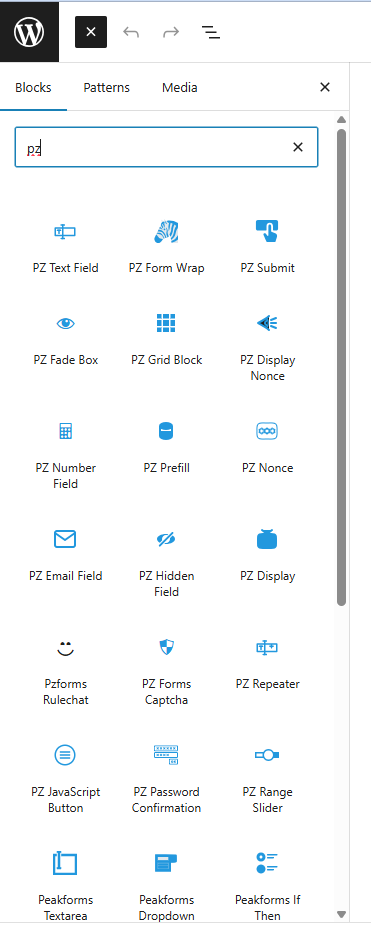 The first thing to do with every form is to insert a PZ Form Wrapper block wherever you’d like the form to appear. One fast way to find this block in the block inserter panel is to search for blocks that start with “pz” (all PeakZebra blocks start with “pz”).